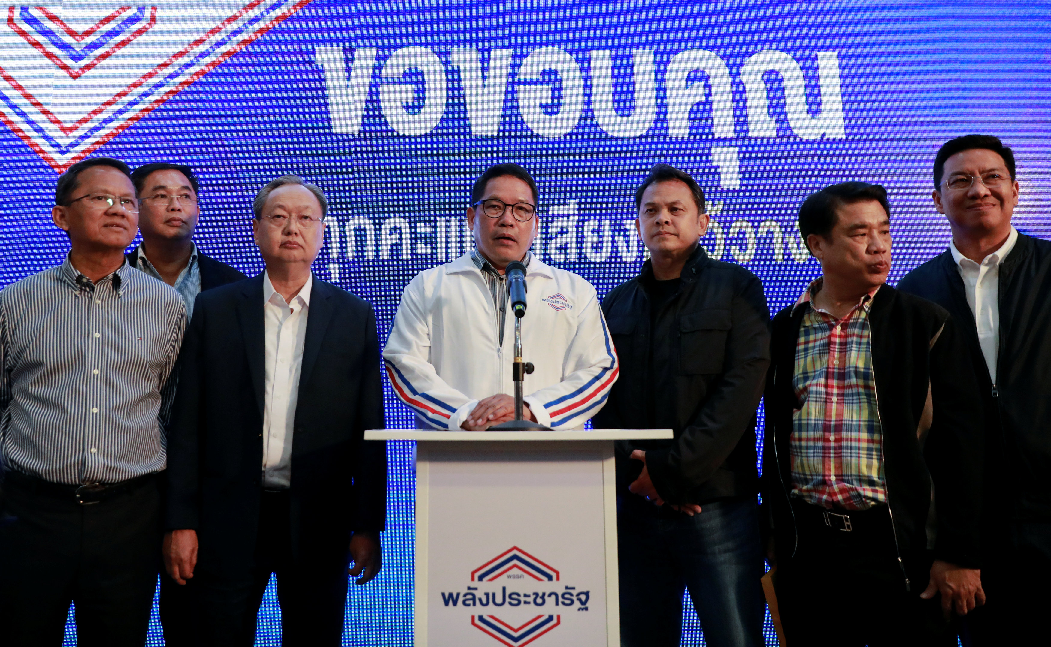 Lãnh đạo đảng Palang Pracharat (trên bục phát biểu) tự tin giành chiến thắng Photo Courtesy: Reuters