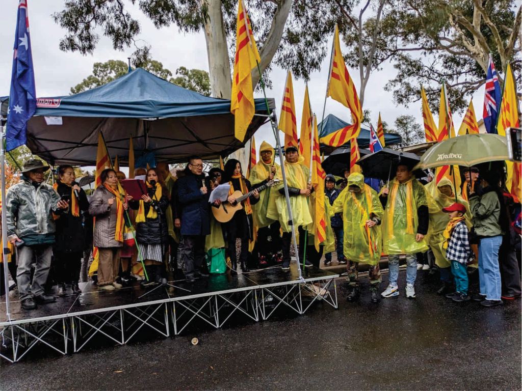 Đoàn đại diện CĐ NVTD Victoria hát nhạc đấu tranh xen kẽ những phát biểu của các đại diện đoàn thể thuộc các tiểu bang và liên bang. Hình: etivituansan