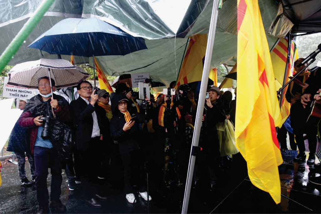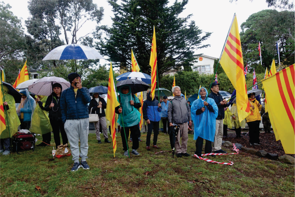 Ông Trần Nhân, đại diện cho tổ chức Hậu Duệ Việt Nam Cộng Hòa và cũng là người điều hợp phái đoàn Tiểu Bang NSW dự cuộc biểu tình, cho biết mặc dù tiên đoán thời tiết sẽ có mưa nhưng đã có hơn 500 người có mặt trước tòa đại sứ CSVN nói lên ý chí tranh đấu, lòng tin của người Việt rằng một ngày nào đó cộng sản sẽ không còn tồn tại “và chúng ta được thanh bình tự do trở về quê hương”.