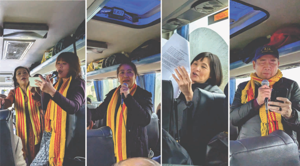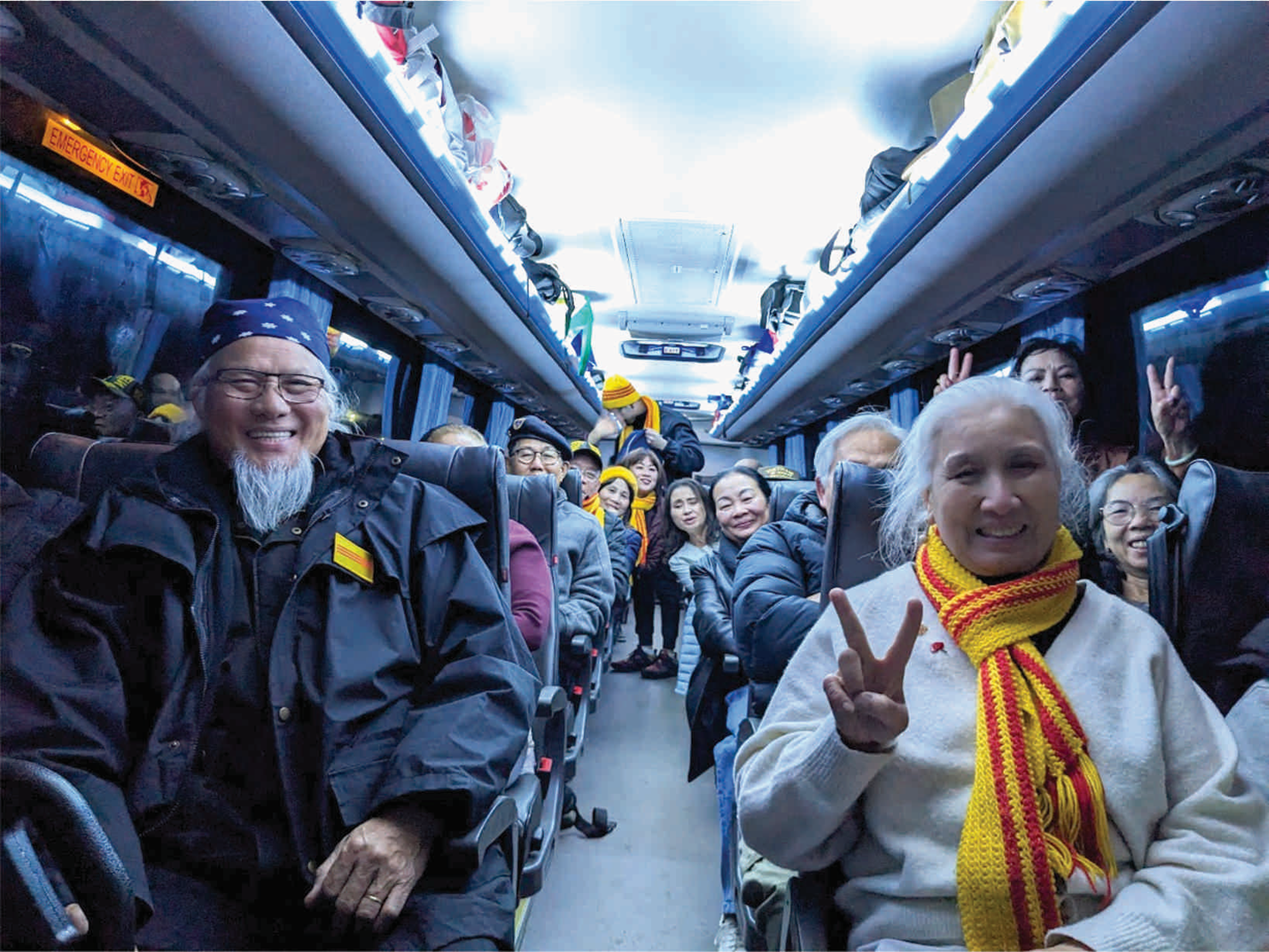 Đúng giờ, 2 chiếc xe bus lên đường. Ông Chủ tịch CĐ Nguyễn Quang Duy và ông Phó Chủ tịch Tài Chánh Kế Hoạch Trần Đông đếm số người có mặt trên xe là 99 người.