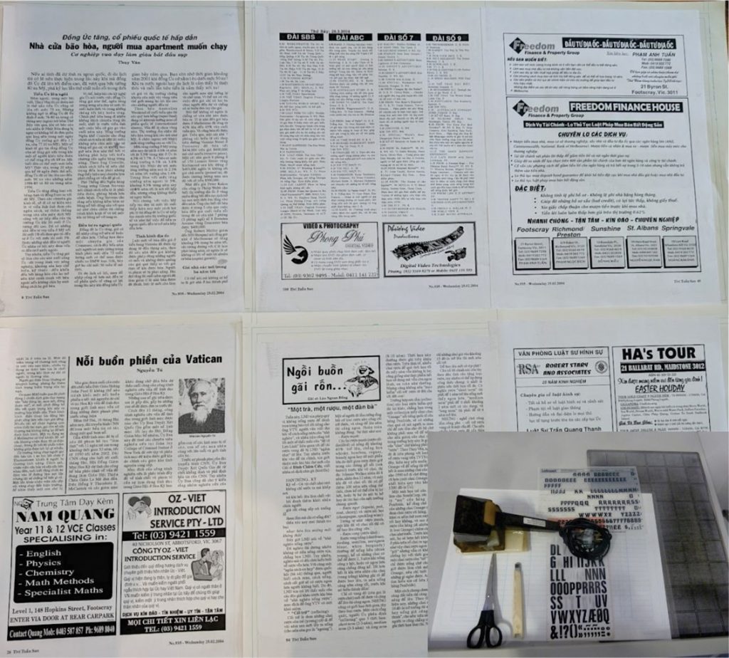 Làm báo thập niên 1980. Đồ nghề để làm báo gồm máy đánh chữ, keo dán, kéo, chữ cái để để chạy tít và giấy đăng bạ TVTS ngày 18/11/1985. Bốn mươi năm nhìn lại, TiVi Tuần-san (TVTS) không chỉ là câu chuyện của một tờ báo Việt ngữ tại Úc, mà là lịch sử thu nhỏ của cả một cộng đồng người Việt tị nạn: bắt đầu từ hai bàn tay trắng, đối diện định kiến, và từng bước xác định chỗ đứng bằng lao động, tri thức và tiếng nói độc lập.