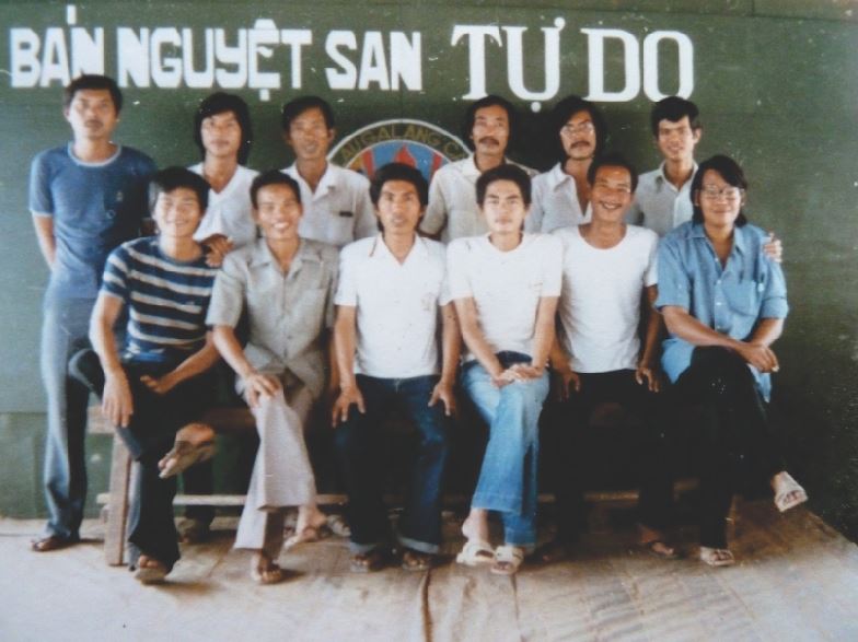 Nguyễn Hồng-Anh (hàng sau, thứ hai từ phải) chụp hình với nhân viên tòa soạn và ban biên tập Bán Nguyệt San Tự Do ở trại tị nạn Galang