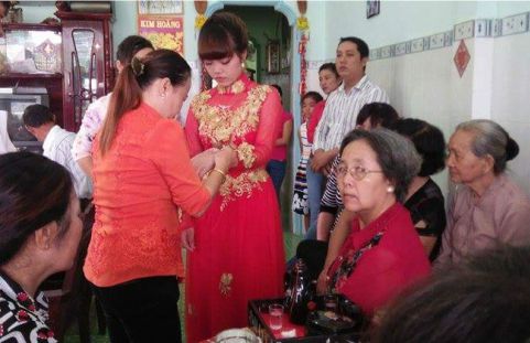 Cô dâu A.T. đang được trao của hồi môn trước khi về nhà