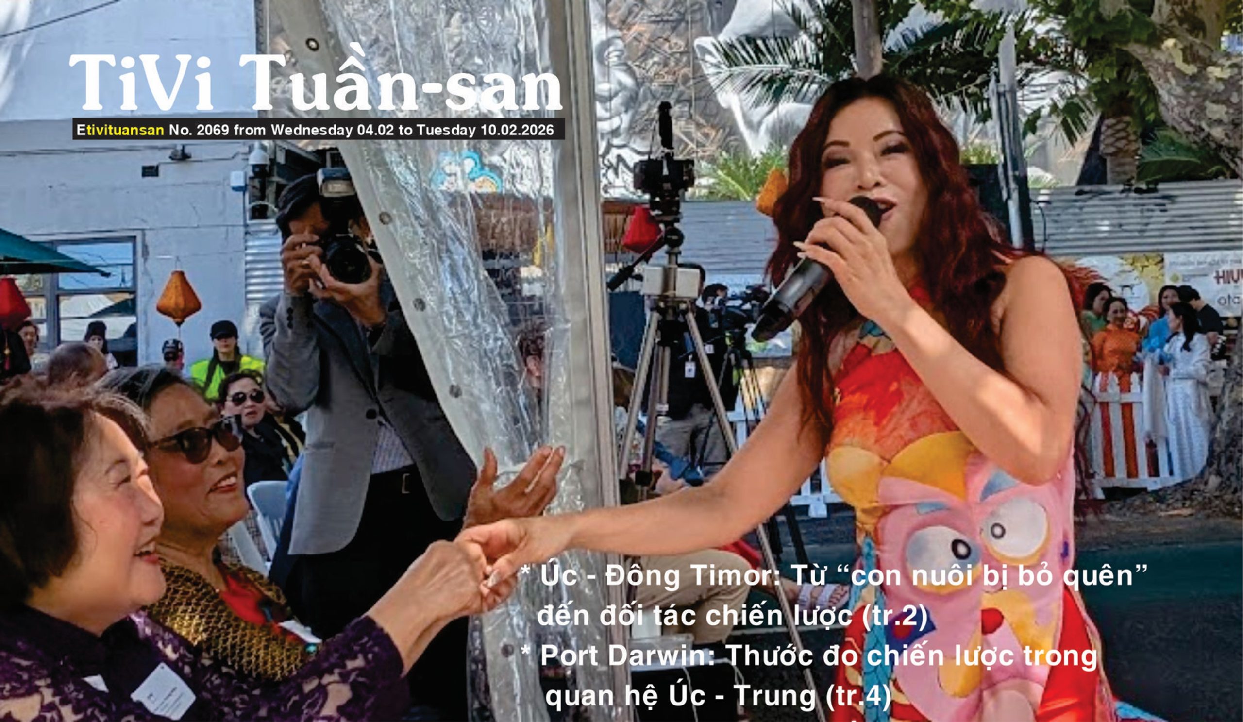 Ca sĩ Nghiêm Lệ trình diễn tại Hội Chợ Tết Richmond trên đường Victoria Street. Hình bìa báo điện tử eTVTS số 2069 phát hành ngày 4/2/2026 Chủ Nhật1//2/2026, Hội chợ Tết trên đường Victoria Street do hội Victoria Street Business Association (trước đây có tên RABA) đã diễn ra tốt đẹp với sự tham dự của nhiều khách du xuân trên con đường từng một thời được gọi là Little Saigon vào thập niên 1980 (xem video phóng sự của TVTS phát hình tuần này (đánh từ khóa: Bính Ngọ ở Úc có gì lạ? Melbourne nơi ăn tết dài nhất thế giới. Phóng sự của TiVi Tuần-san) thực hiện bởi Chủ bút Nguyễn Hồng-Anh và Luật sư Nguyễn Tân Hải.