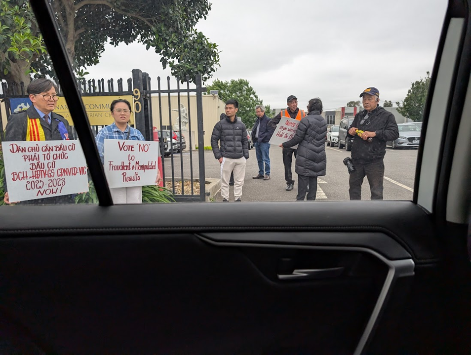 Trước giờ họp, một nhóm nhỏ vài người biểu tình đứng trước cổng trung tâm Sinh hoạt Cộng đồng cầm biểu ngữ  chống Ban Chấp hành cũng như Nội quy 2024 với những chữ như “Dân chủ cần bầu cử, phải tổ chức bầu cử BCH CĐNVTD Vic 2025-2028 Now” (do ông Nguyễn Thế Phong, cựu Chủ tịch CĐNVTD-Vic cầm) và “Vote NO to fraudulent & manipulated results” do một phụ nữ trẻ cầm.