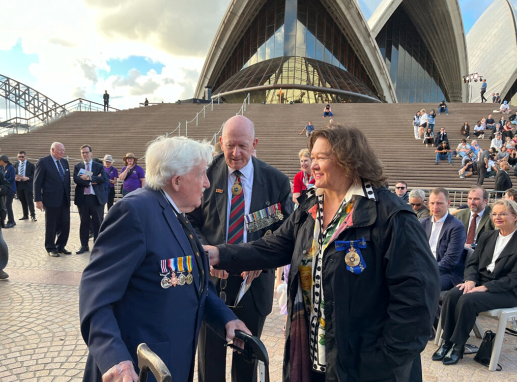 Bà tỉ phú Gina Rinehart (bên phải) và Đại tướng hồi hưu Sir Peter Cosgrove (ở giữa) chuyện trò với một cựu chiến binh Úc tại buổi Vọng ANZAC năm ngoái ở Sydney Opera House. Photo courtesy: GinaRinehart.com.au