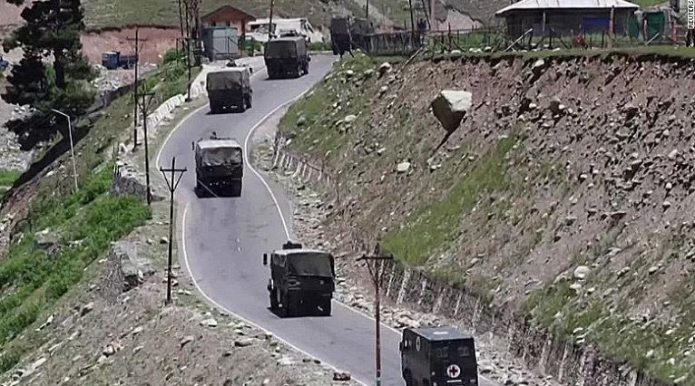 Xe của quân đội Ấn Độ di chuyển về khu vực Galwan, nơi xảy ra vụ đụng độ chết người với lính Trung Quốc, vào ngày 18/6/2020. Photo courtesy: Reuters