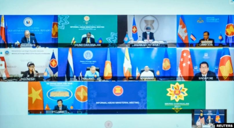 Các thành viên ASEAN trong một cuộc họp trực tuyến vào ngày 2/3/2021. Photo courtesy: Reuters Các nhà lãnh đạo Đông Nam Á cho biết họ đã đạt đồng thuận về một kế hoạch với nhà lãnh đạo chính quyền quân sự Myanmar vào ngày thứ Bảy để chấm dứt cuộc khủng hoảng ở quốc gia chìm trong bạo lực này, nhưng ông này không hồi đáp một cách rõ ràng yêu cầu ngừng sát hại người biểu tình.