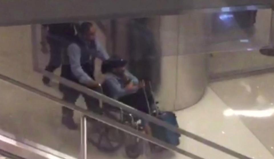 Bà Marilou Danley, bạn gái nghi phạm xả súng ở Las Vegas, được nhìn thấy ngồi trên xe lăn khi đáp xuống sân bay Los Angeles để chuẩn bị trả lời thẩm vấn FBI.