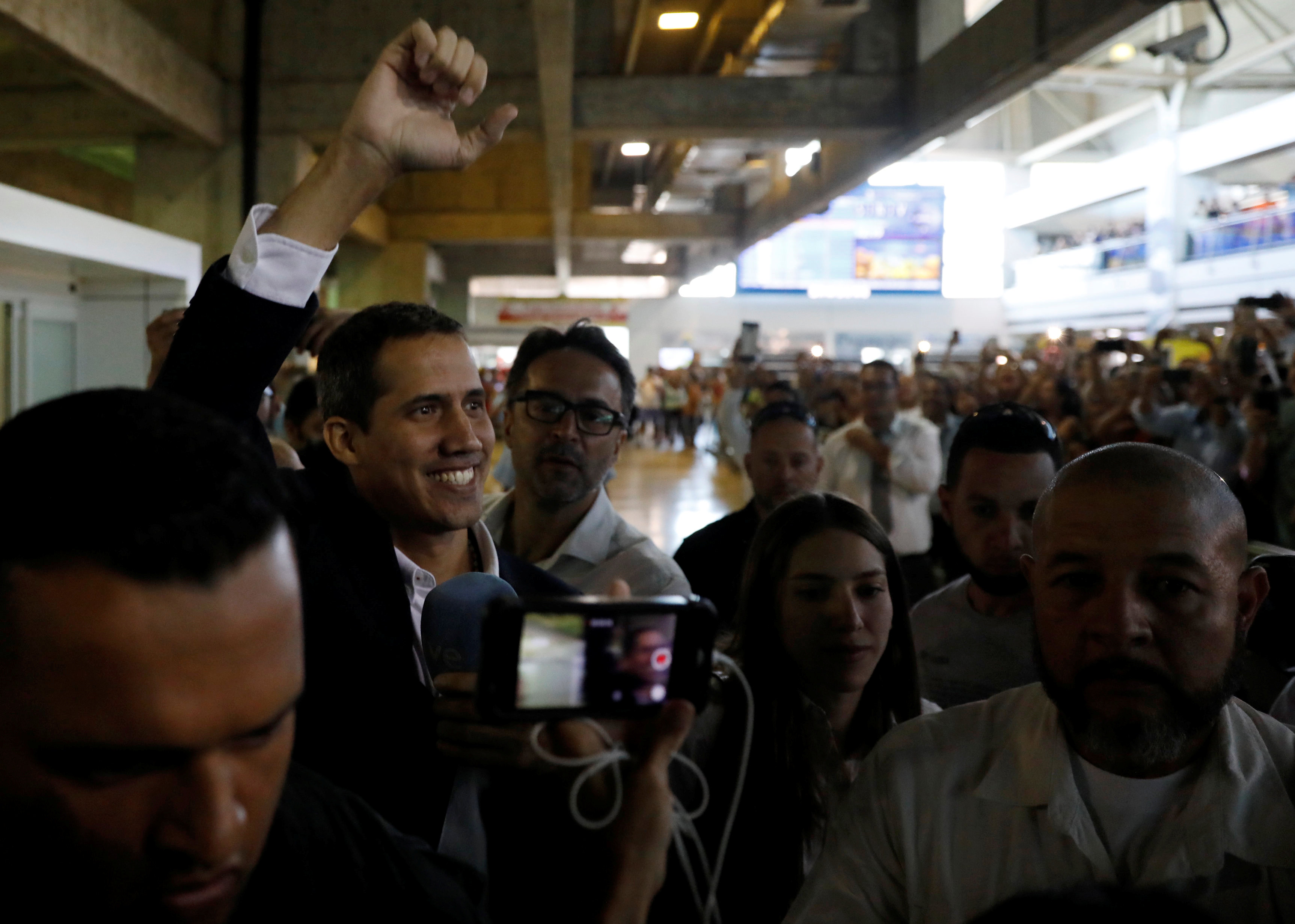 Lãnh đạo đối lập sau đó lên một chiếc xe, vẫy cờ Venezuela và hét lên “Đúng, chúng ta có thể!”, trước khi đến quảng trường ở thủ đô, nơi đám đông khổng lồ những người ủng hộ chào đón ông. Theo một phụ tá cao cấp, Guaido về nước trên chuyến bay thương mại của hãng Copa Airlines từ thành phố Panama.