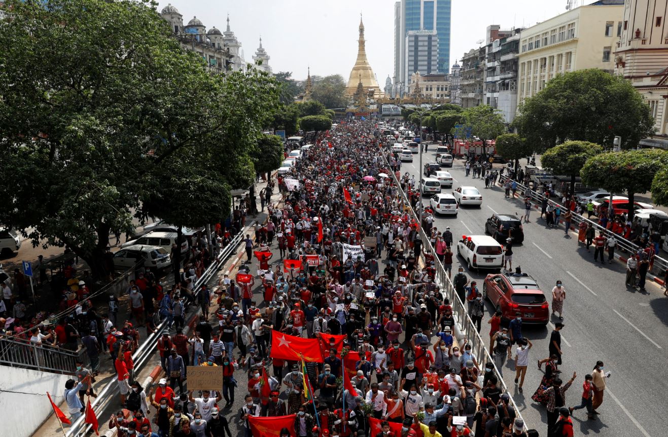 Ngưởi biểu tình tuần hành phản đối cuộc đảo chính ở Yangon, ngày 7 tháng 2, 2021. Photo courtesy: REUTERS Những người biểu tình ở Myanmar tập hợp hôm thứ Tư 17/2 với số lượng lớn nhất từ trước đến nay để phản đối việc quân đội tiếm quyền bằng cuộc đảo chính hôm 1/2.