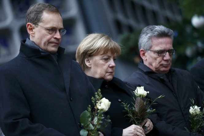 Thủ tướng Đức Angela Merkel đặt hoa tưởng niệm các nạn nhân vụ tấn công ở Berlin. Photo Courtesy: Reuters Cảnh sát Đức ngày 20.12 cho biết “không chắc” nghi can bị bắt có phải là kẻ lái xe tấn công chợ giáng sinh Berlin hay không sau khi một tờ báo địa phương đưa tin hung thủ thật sự vẫn đang tự do và có vũ trang.