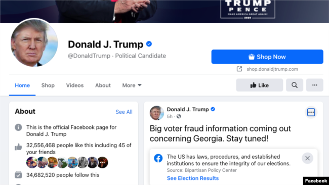 Tài khoản cá nhân của Tổng thống Donald Trump trên in Facebook. Photo courtesy: Facebook Công ty thương mại điện tử Shopify Inc có trụ sở tại Canada ngày 7/1 dỡ bỏ các cửa hàng buôn bán trực tuyến trên mạng có liên hệ với Tổng thống Donald Trump, viện dẫn lý do hành động của ông Trump vi phạm các chính sách của công ty.