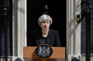 Bà May đã chỉ trích tư tưởng xấu xa của chủ nghĩa Hồi giáo cực đoan đứng sau 3 vụ tấn công khủng bố tại Anh kể từ tháng 3. Bà cho rằng thủ phạm gây ra các vụ tấn công này đang bắt chước nhau. Bà còn cho hay 3 kẻ tấn công đã mặc áo cài thuốc nổ giả để gieo rắc sự hoảng loạn và kinh hãi.