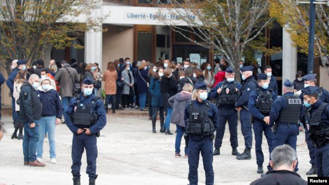 Người dân tụ tập bên ngoài trường College du Bois d’Aulne sau vụ tấn công ở Conflans St Honorine ngoại ô Paris, Pháp, ngày 17 tháng 10, 2020. Photo courtesy: Reuters