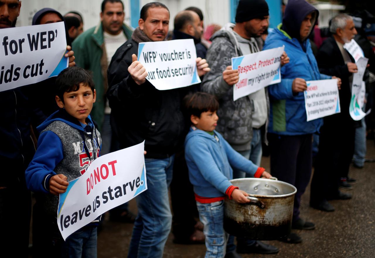 Những đứa trẻ tị nạn người Palestine đang chờ đến lượt nhận lương thực hôm 17.1.2018. Photo Courtesy: Reuters