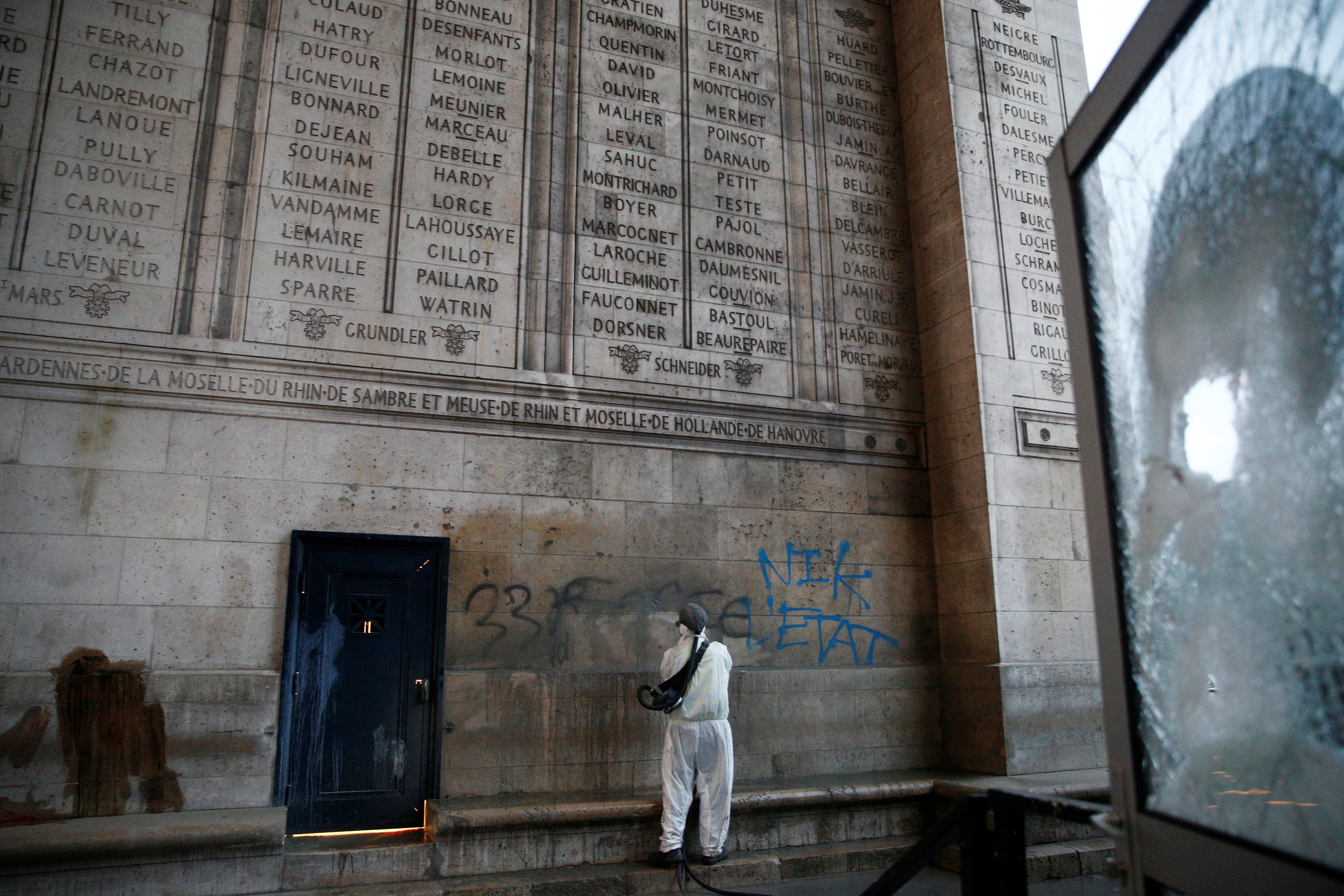 Dòng chữ nguệch ngoạc viết bằng sơn trên tường Khải Hoàn Môn với thông điệp kêu gọi ông Macron từ chức. Photo courtesy: Reuters