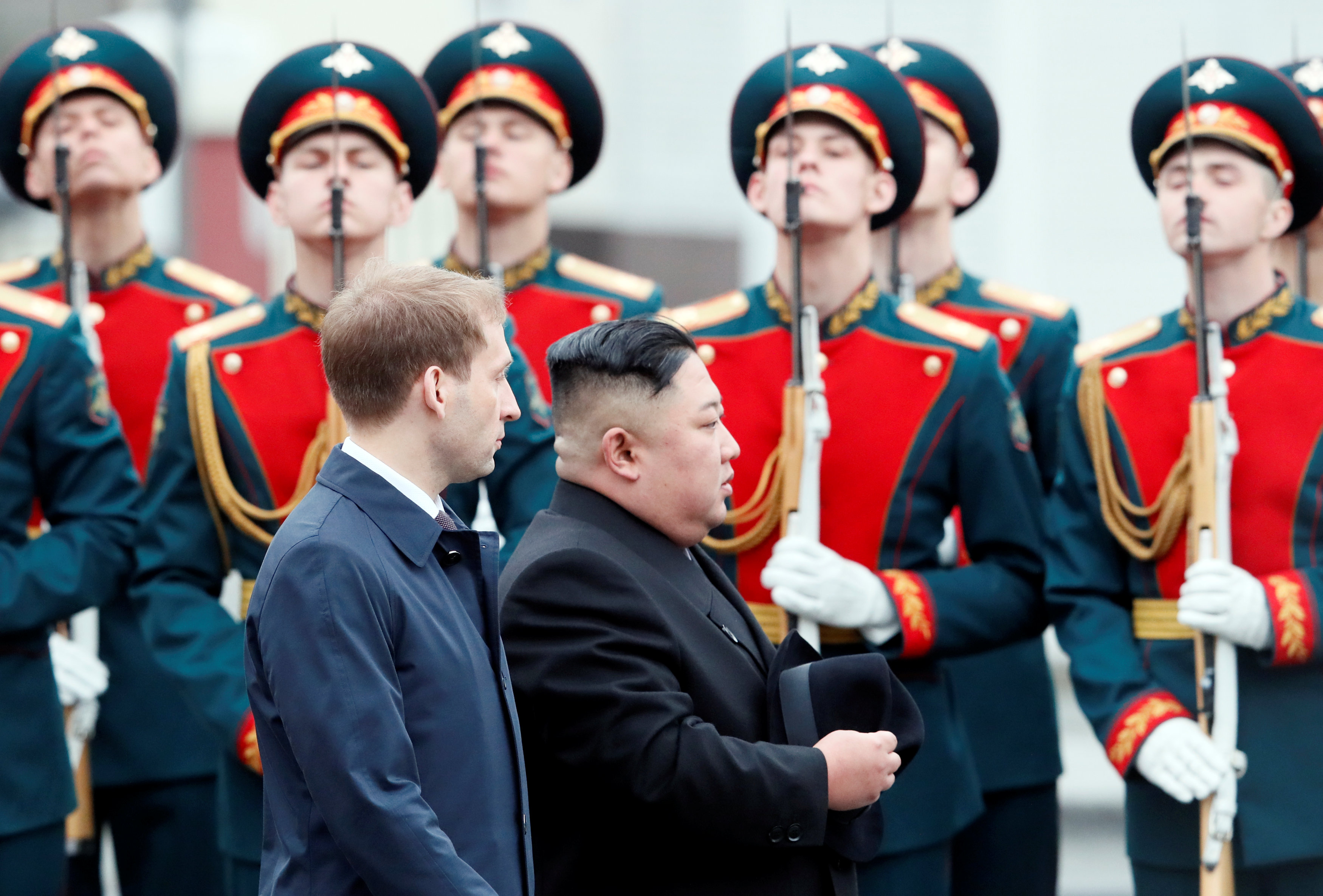 Các quan chức Nga đón tiếp nhà lãnh đạo Kim Jong-un. Photo courtesy: Reuters Chủ tịch Triều Tiên Kim Jong-un đã tới thành phố Vladivostok, miền Đông nước Nga, để chuẩn bị dự Hội nghị Thượng đỉnh đầu tiên với Tổng thống Nga Vladimir Putin.