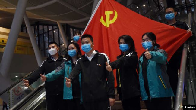 Các nhân viên y tế đến từ những tỉnh khác chụp ảnh lưu niệm trước lá cờ Đảng CSTQ tại ga xe lửa trước khi rời Vũ Hán, tâm dịch COVID-19, ngày 17/3/2020. Photo courtesy: REUTERS/Stringer