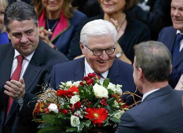 Ông Frank-Walter Steinmeier (giữa) nhận hoa chức mừng đắc cử tổng thống Đức sau cuộc bầu chọn tại Hạ viện ngày12.2. Photo courtesy: Reuters Cựu ngoại trưởng Đức, đảng viên đảng Xã hội Dân chủ Frank-Walter Steinmeier đã được bầu làm tổng thống Đức.