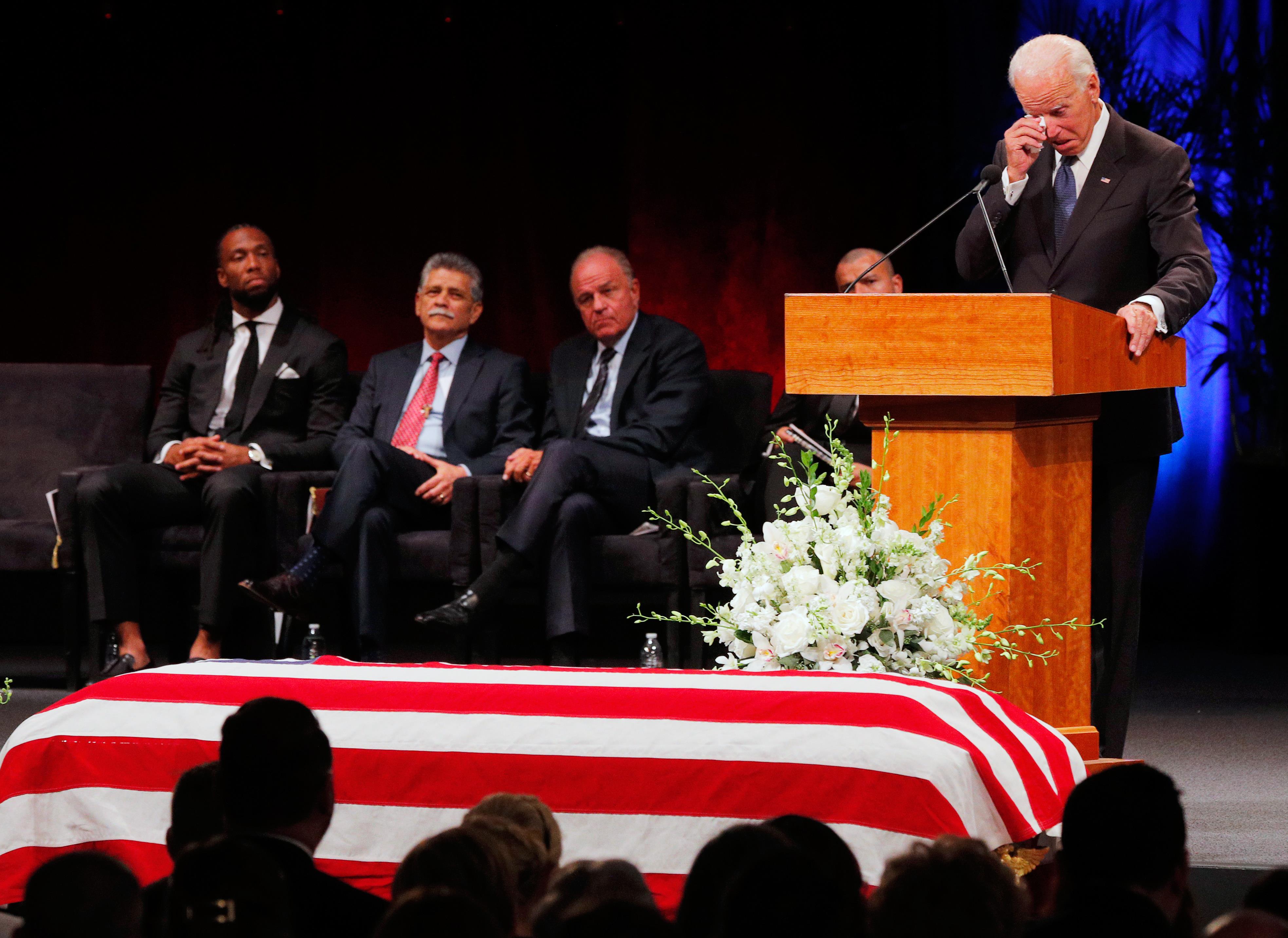 Bài phát biểu “tiễn đưa” của ông Biden có những khúc tràn nước mắt. Ông Biden lau nước mắt và không ngần ngại kể về những khoảng thời gian ông trải qua nhiều đau thương trong cuộc đời. Người vợ đầu tiên của ông qua đời trong một vụ tai nạn xe năm 1972. Người con trai của ông, Beau, cũng qua đời năm 2015 vì căn bệnh ung thư não, giống với căn bệnh của ông McCain.