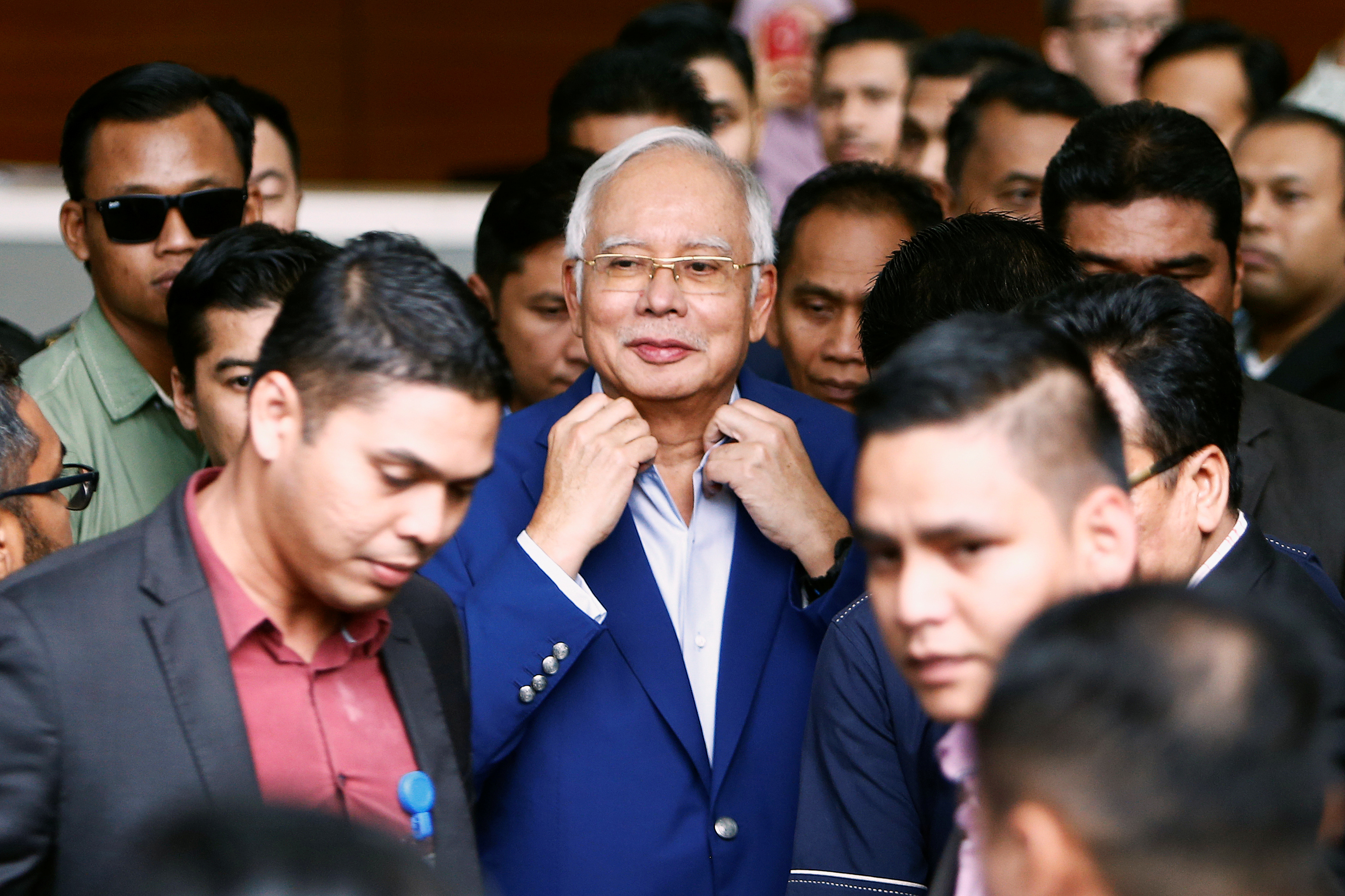 Ông Najib mặc sơ mi xanh nhạt và áo vest xanh dương, vẻ mặt tươi cười, được nhân viên an ninh hộ tống, di chuyển chậm qua hàng rào phóng viên tụ tập bên ngoài để vào trụ sở Ủy ban Chống tham nhũng.