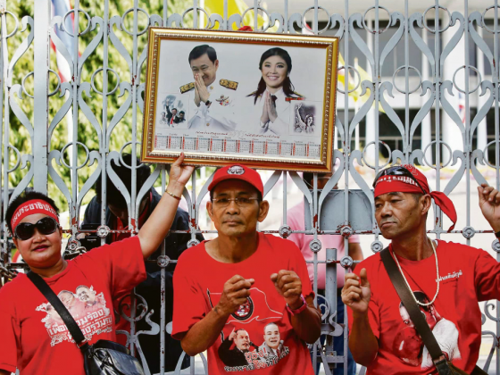 Một người ủng hộ gia đình Shinawatra giơ cao bức ảnh chụp chung của hai anh em cựu Thủ tướng Thái Lan Thaksin và Yingluck Shinawatra. Photo Courtesy: Reuters