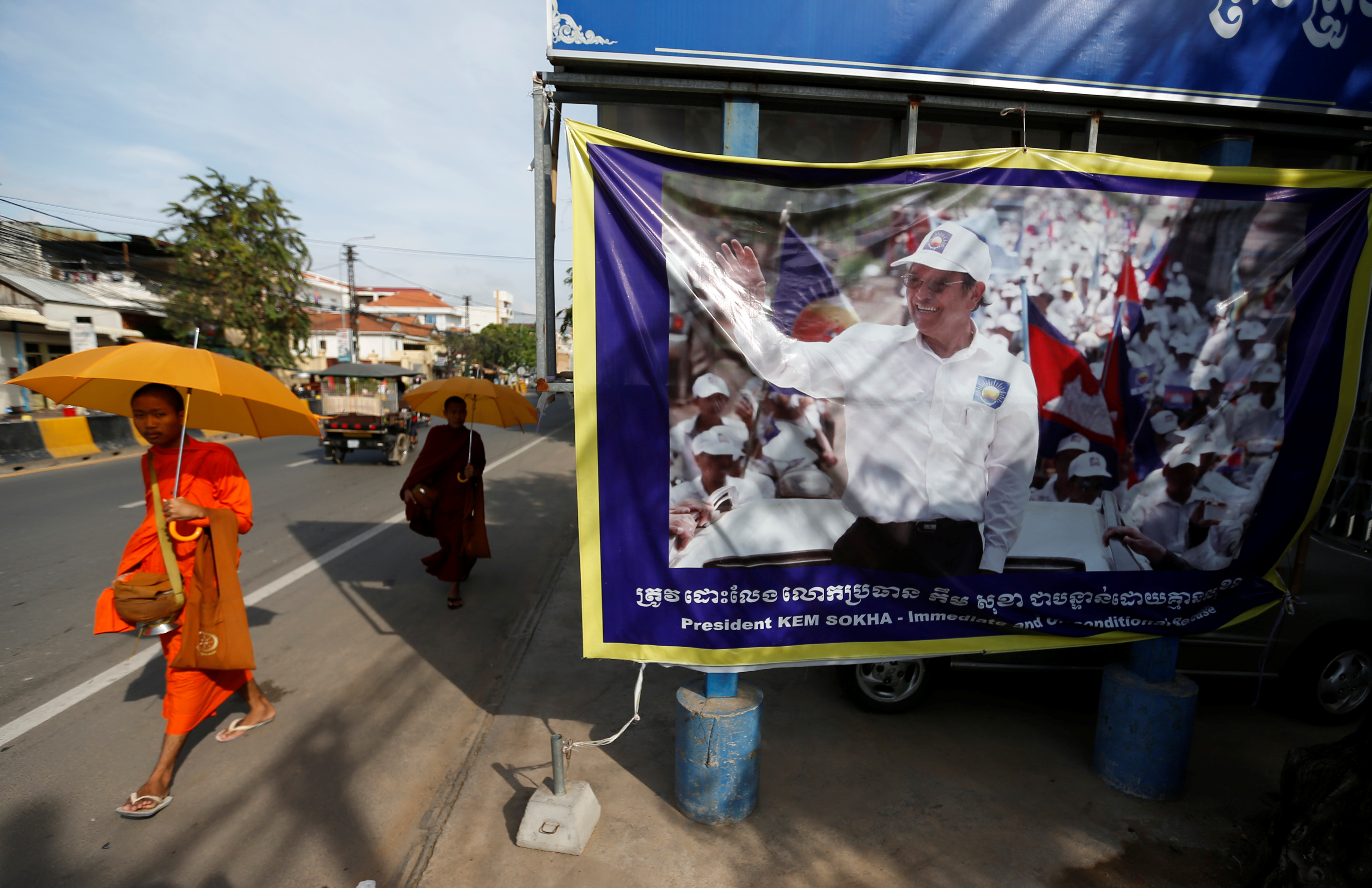 Một nhà sư đi ngang qua một tấm áp phích treo ảnh ông Kem Sokha hôm 17.11.2017. Photo Courtesy: Reuters