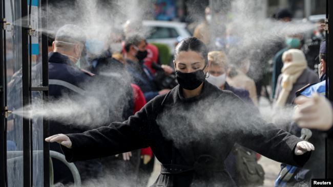Khách hàng được xịt khử trùng trước khi bước vào chợ ở Tirana, Albania, ngày 6/4/20. Photo courtesy: Reuters Danh sách những mất mát, đau thương vì đại dịch COVID-19 ngày càng dài thêm khi con người mất đi cả những cái nắm tay, ôm nhau, những sự thăm viếng trong lúc họ cần nhất.
