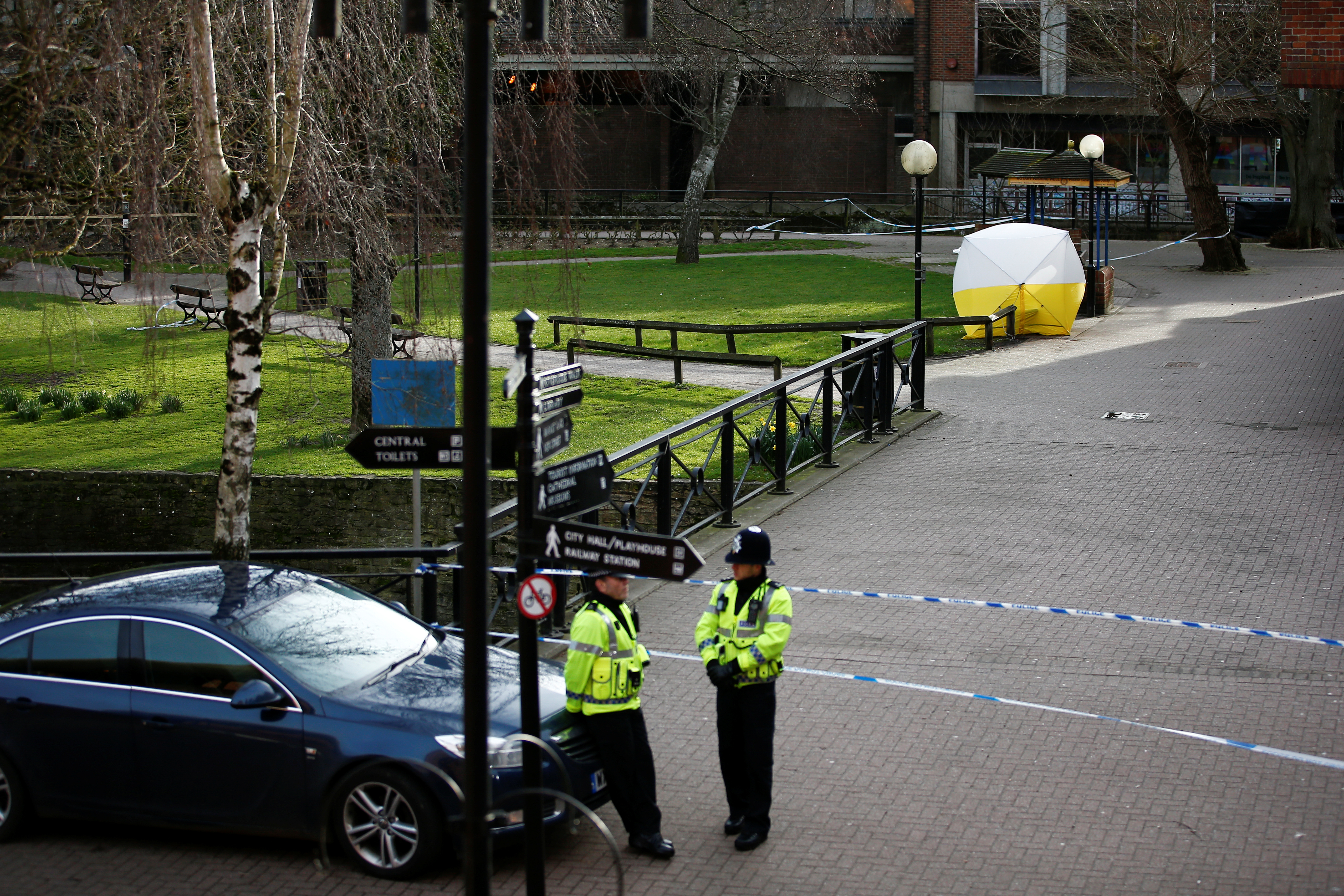 Cảnh sát Anh phong tỏa khu vực điệp viên Nga bị đầu độc. Photo Courtesy: Reuters Liên quan đến vụ cựu điệp viên Nga bị đầu độc tại Anh, Bộ trưởng Ngoại giao Nga Sergei Lavrov hôm 13.3 tuyên bố Mạc Tư Khoa sẽ không trả lời “tối hậu thư” của Anh cho đến khi nhận được mẫu chất độc từ London.