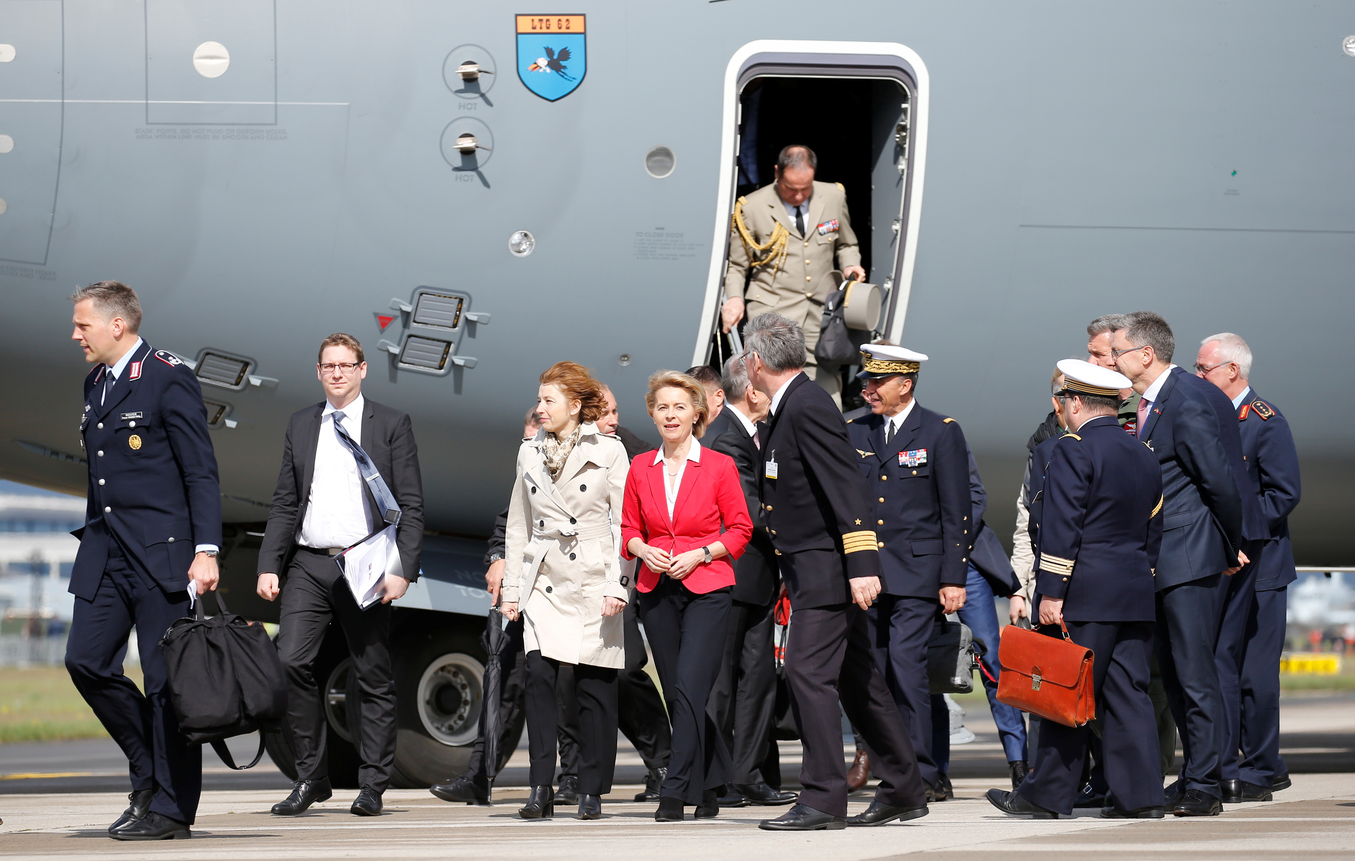 Bộ trưởng Quốc phòng Đức Ursula von der Leyen (áo đỏ) thăm căn cứ không quân LA Air ở Berlin, Đức hôm 26.4.2018. Photo Courtesy: REUTERS/Axel Schmidt