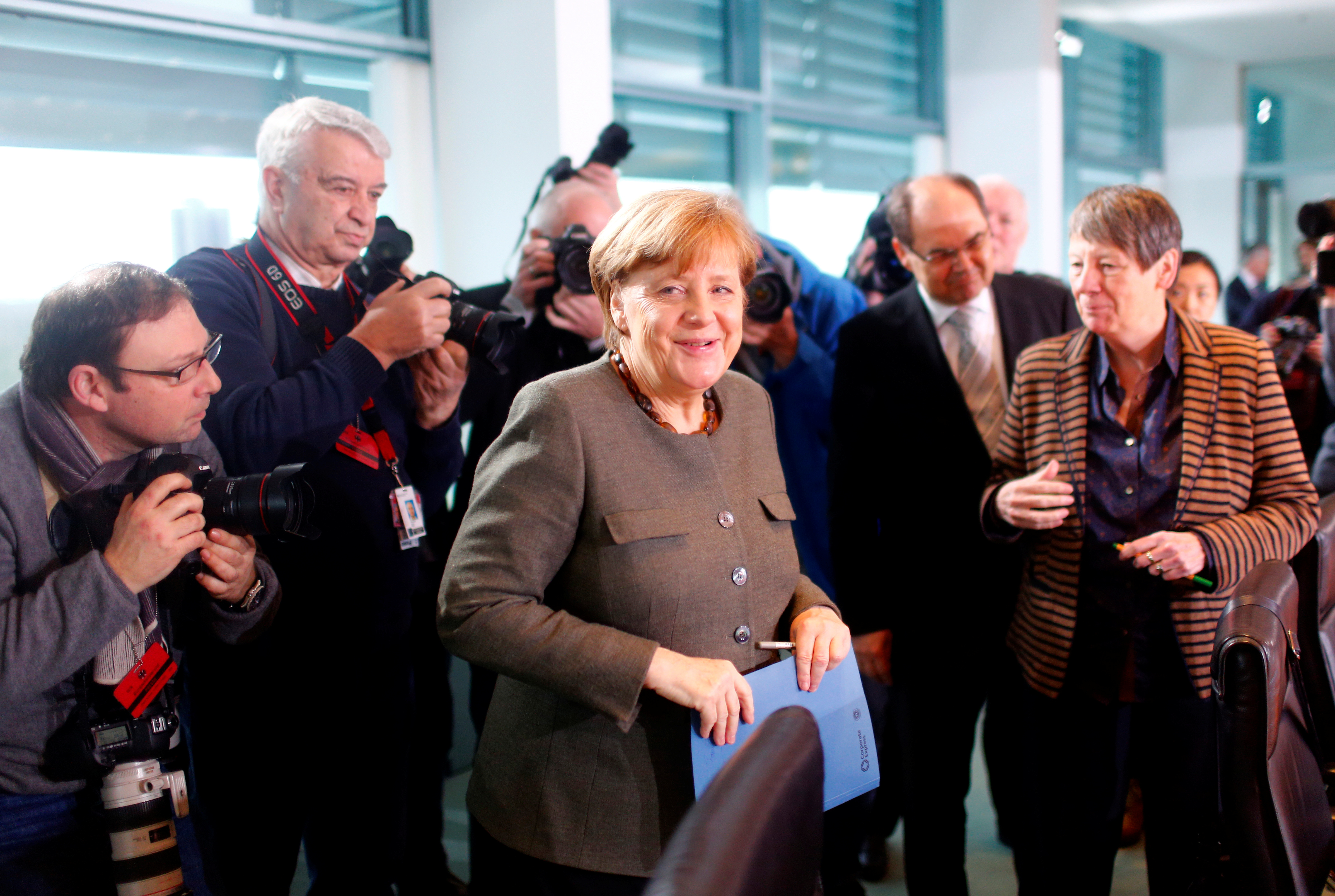 Thủ tướng Đức vui vẻ sau khi tham dự một phiên họp hôm 31.1.2018. Photo Courtesy: Reuters
