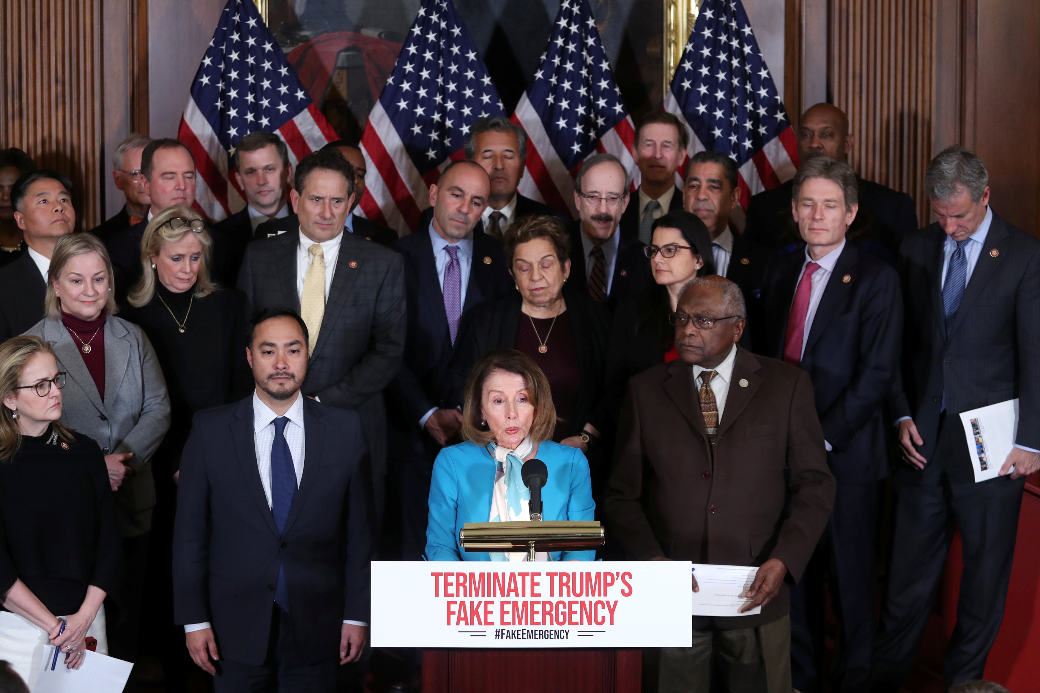 Chủ tịch Hạ viện Mỹ, bà Nancy Pelosi tổ chức buổi họp báo ngày 25-2 ở thủ đô Washington về dự luật ngăn chặn tuyên bố tình trạng khẩn cấp của ông Trump và gọi đây là “tuyên bố tình trạng khẩn cấp quốc gia giả mạo”. Photo Courtesy: Reuters Hạ viện Mỹ ngày 26.2 đã thông qua dự luật nhằm ngăn chặn Tổng thống Mỹ Donald Trump nhận được ngân sách để xây dựng bức tường biên giới với Mexico thông qua tuyên bố về tình trạng khẩn cấp quốc gia.
