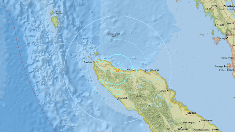 Khu vực bị động đất. Photo Courtesy: USGS Hai trận động đất liên tiếp vừa xảy ra ở tỉnh Aceh, Nam Dương. Tin ban đầu cho biết nhiều nhà cửa bị hư hại và nhiều người bị thương.