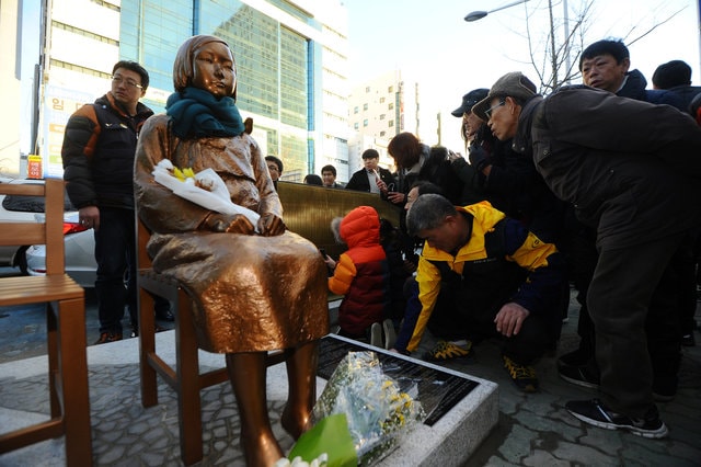 Bức tượng tạc hình cô gái trẻ, ngồi trên chiếc ghế, tượng trưng những phụ nữ Hàn Quốc bị bắt làm nô lệ tình dục cho lính Nhật trong thời Thế chiến 2, được dựng lên hôm 30.12.2016, theo hãng tin Kyodo ngày 6.1. Một bức tượng tương tự cũng được dựng bên ngoài Đại sứ quán Nhật ở Seoul hồi năm 2011.