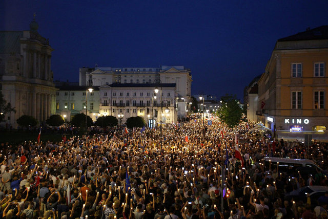 Chính quyền thủ đô Warsaw cho biết có khoảng 50,000 người biểu tình tập trung trước dinh tổng thống, vẫy cờ Ba Lan và cờ EU, hô hào “Chúng ta sẽ bảo vệ nền dân chủ” và “tòa án tự do”.