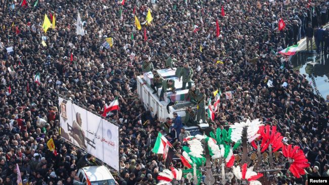 Hôm 6/1, hàng trăm ngàn người Iran đã xuống đường biểu tình trên đường phố Tehran trong tang lễ của chỉ huy quân đội Qassem Soleimani. Photo courtesy: Reuters Hôm 6/1, hàng trăm ngàn người Iran đã xuống đường biểu tình trên đường phố Tehran trong tang lễ của chỉ huy quân đội Qassem Soleimani, người bị triệt hạ trong vụ tấn công của máy bay không người lái của Hoa Kỳ vào tuần trước. Hãng tin Reuters dẫn lời con gái tướng Soleimani nói rằng cái chết của ông sẽ dẫn tới một “ngày đen tối” cho Hoa Kỳ.
