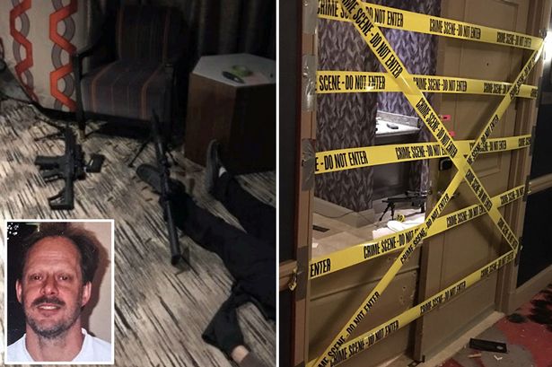 Những hình ảnh khác về căn phòng cho thấy đạn và và súng trường xếp chồng lên nhau. Một lỗ nhỏ xuất hiện trên cửa ra vào, có thể là do thủ phạm đã bắn nhân viên an ninh của khách sạn khi vụ xả súng diễn ra.
