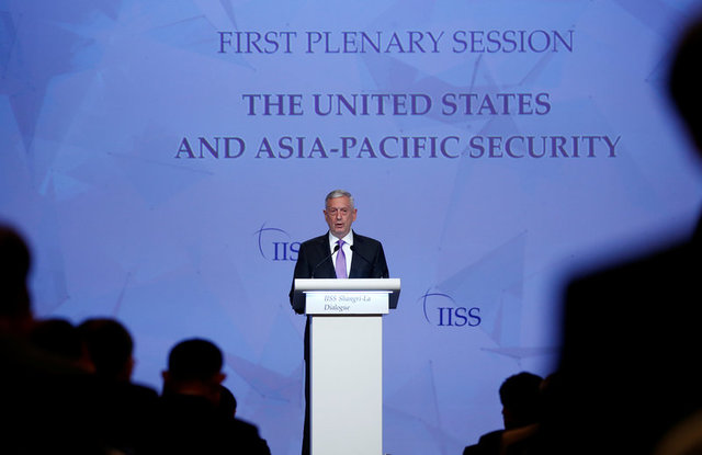 Bộ trưởng Quốc phòng Mỹ James Mattis phát biểu tại Đối thoại Shangri-La sáng 3.6.2017 tại Tân Gia Ba. Photo Courtesy: Reuters Trong bài phát biểu tại Đối thoại Shangri-La hôm nay 3.6, Bộ trưởng Quốc phòng Mỹ James Mattis tuyên bố Mỹ tiếp tục phản đối việc Trung Quốc xây dựng trái phép và quân sự hóa ở các khu vực tranh chấp trên Biển Đông.