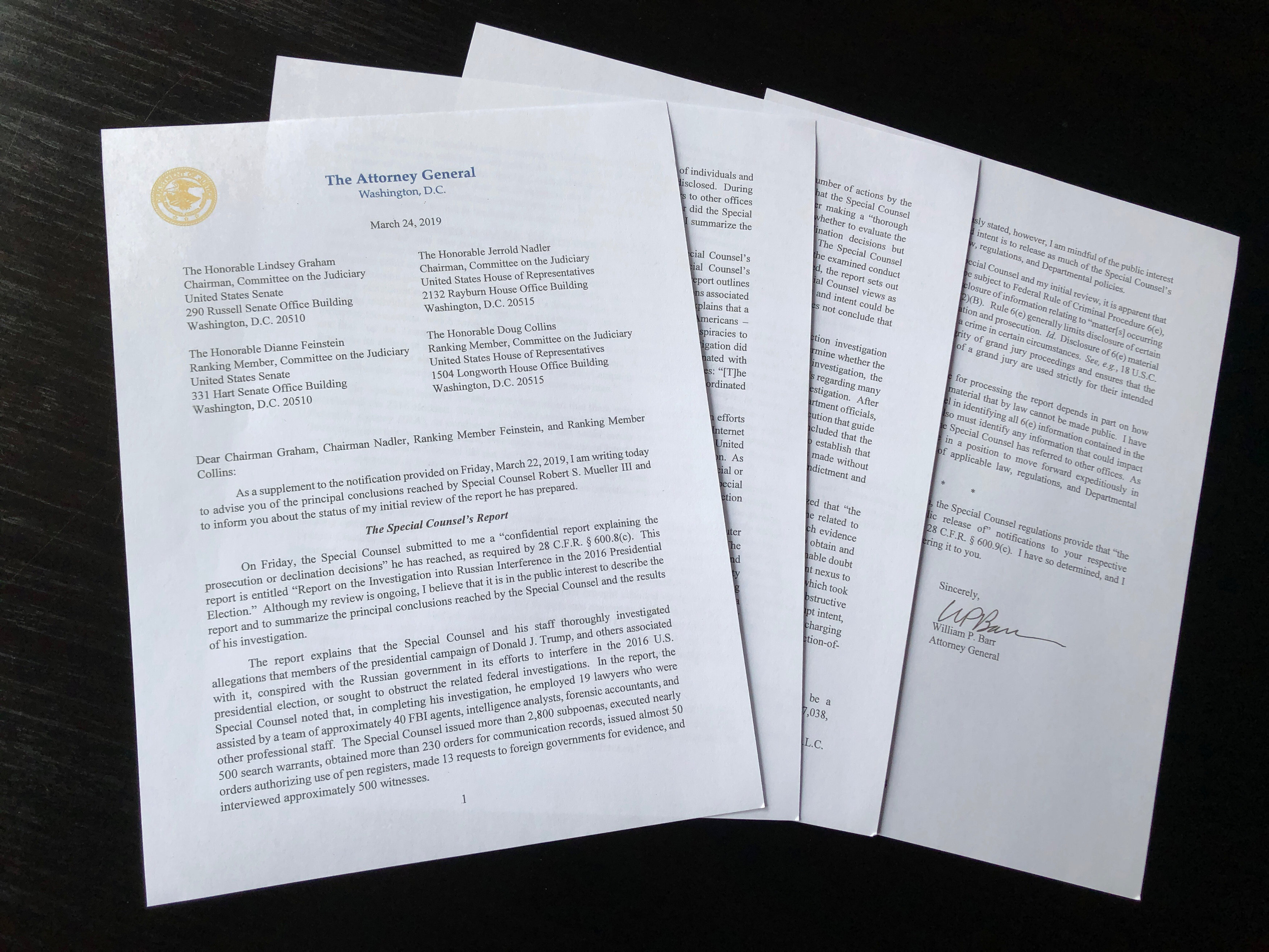 Bức thư dài 4 trang gửi Quốc hội, Tổng Chưởng lý William Barr ngày 24-3 trích báo cáo của ông Mueller. Photo Courtesy: Reuters Báo cáo từ cuộc điều tra của công tố viên đặc biệt Robert Mueller cho thấy Tổng thống Trump không thông đồng với Nga và không cản trở pháp lý.
