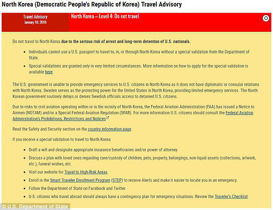 Cảnh báo này được cơ quan Ngoại giao Mỹ đưa ra cách đây ít giờ trên trang web của mình. Theo đó, những ai muốn tới thăm Triều Tiên nên chuẩn bị cho kịch bản tồi tệ nhất, bao gồm việc sắp xếp trước lễ tang, chuẩn bị di chúc, kê khai tài sản cho người thân và bạn bè.