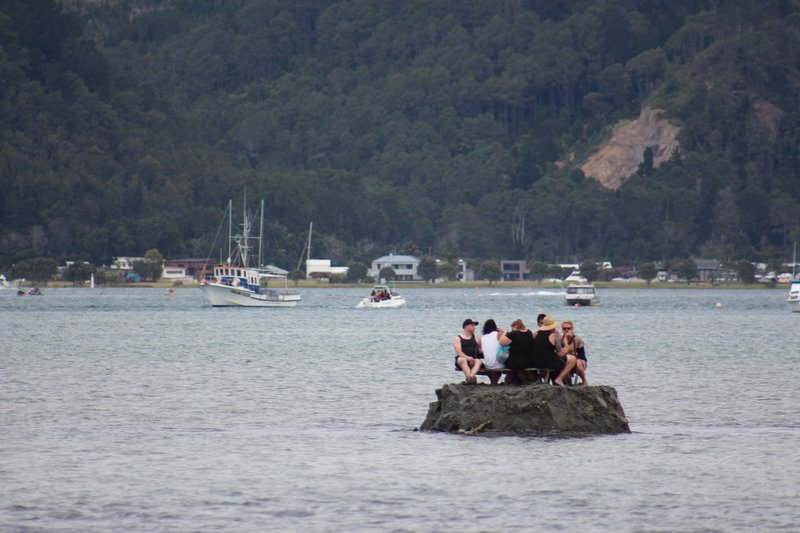 Nhóm người đắp ‘đảo’ để được uống bia đón năm mới. Photo Courtesy: David Saunders/Tairua ChitChat/Social Media