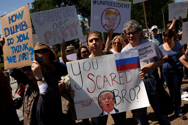 Biểu tình phản đối ông Trump diễn ra sau khi Giám đốc FBI James Comey bị sa thải. Photo courtesy: Reuters Những nghi vấn chung quanh vấn đề Tổng tống Mỹ Donald Trump bất ngờ sa thải Giám đốc Cục điều tra liên bang Mỹ (FBI) James Comey, người đang muốn tăng cường điều tra nghi án Nga can thiệp bầu cử Mỹ, đang vẫn là đề tài nóng hỏi.