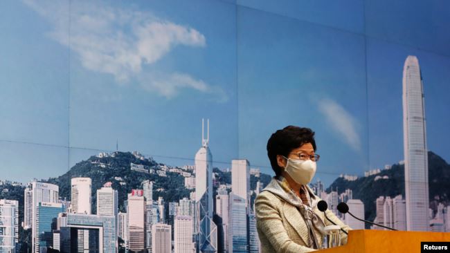 Trưởng đặc khu Hong Kong Carrie Lam tại một cuộc họp báo trước khi luật an ninh được ban hành. Ảnh chụp tại Hong Kong ngày 30/6/2020. Photo courtesy: REUTERS/Tyrone Siu