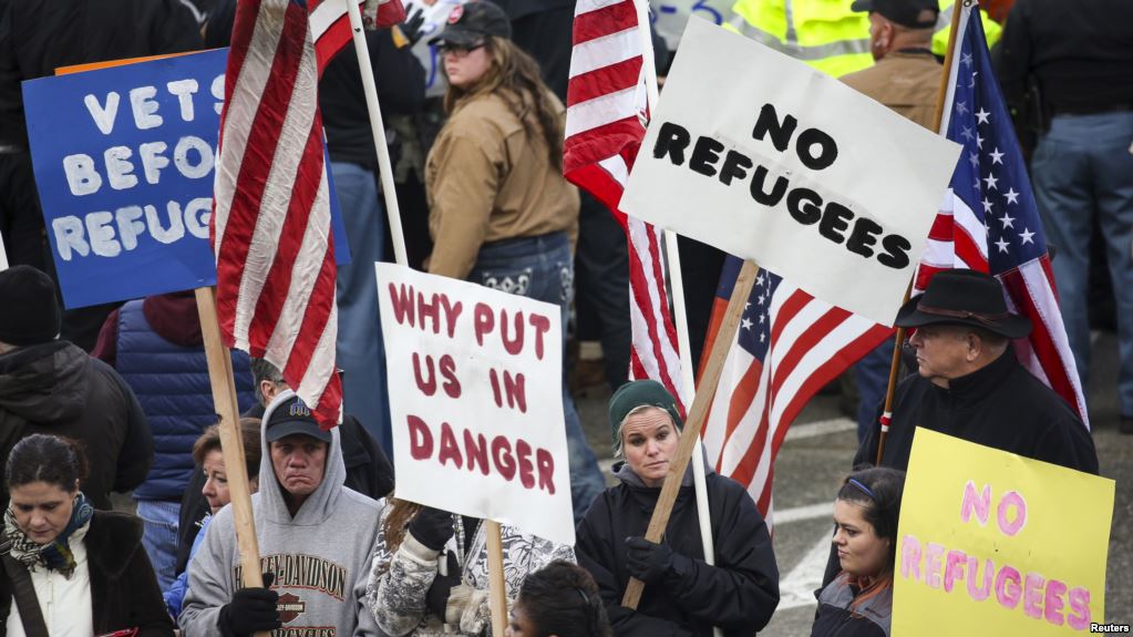 Những người biểu tình phản đối người tị nạn ở Mỹ. Photo Courtesy: Reuters Lệnh cấm người tị nạn của tổng thống Mỹ Donald Trump đã kết thúc ngày 24.10 sau 4 tháng có hiệu lực.