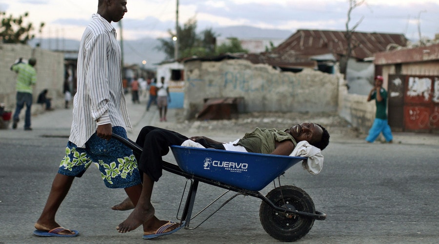Một người đàn ông đẩy một bệnh nhân bị dịch tả ở Haiti. Photo Courtesy: Reuters