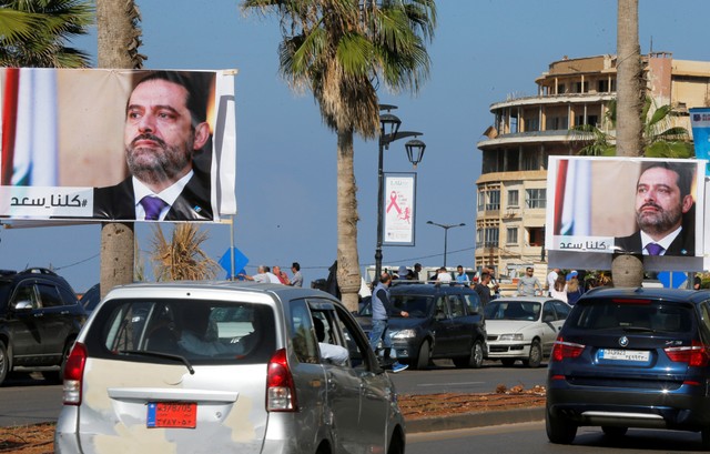 Chân dung của Thủ tướng Saad al-Hariri treo khắp đường phố ở Beirut. Lebanon hôm 10.11.2017. Photo Courtesy: Reuters Tổng thống Liban Michel Aoun tuyên bố Thủ tướng vừa xin từ chức của nước này, ông Saad al-Hariri, buộc phải trở về nước.