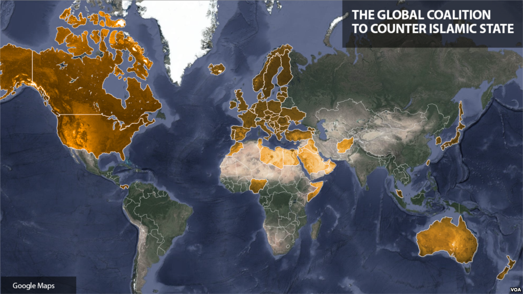 Bản đồ liên minh toàn cầu chống Nhà nước Hồi giáo. Photo Courtesy: Google Map Từ việc ngăn chặn làn sóng các chiến binh nước ngoài cho đến truy lùng các nguồn tài trợ của khủng bố, các nhà lãnh đạo Liên minh toàn cầu trong tuần này gặp nhau tại Washington để tìm kiếm các phương cách tăng cường áp lực hơn nữa đối với tổ chức hiếu chiến Nhà nước Hồi Giáo.