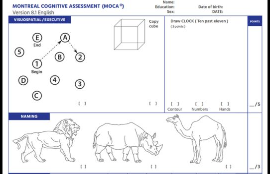 Người làm bài đánh giá cũng phải nhận dạng tên các con vật trong các bức tranh được đưa ra như sư tử, tê giác, hay phải tự vẽ một khối hình hộp. Ngoài ra, người đó cũng được yêu cầu nhắc lại theo cả chiều xuôi và ngược 5 từ mà bác sĩ đọc với tốc độ 1 từ/giây.