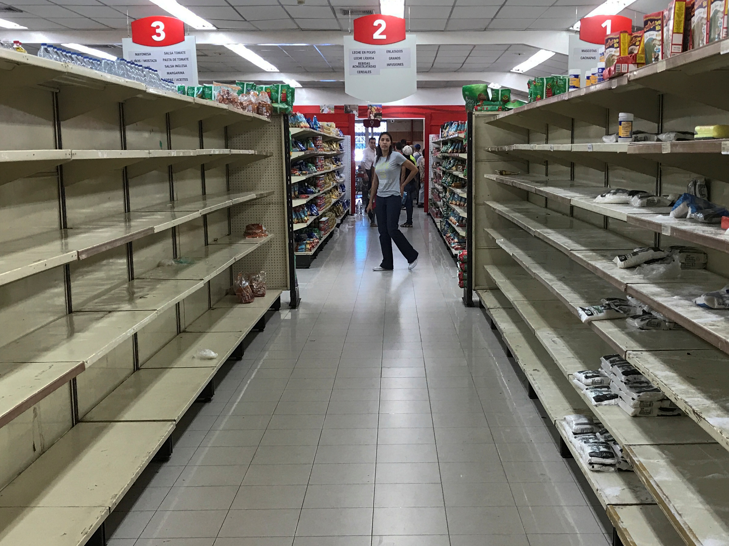 Một phụ nữ bước qua những kệ hàng trống trong siêu thị ở Venezuela. Photo Courtesy: Reuters Đồng tiền mất giá và người dân thiếu thốn mọi bề. Các vụ tấn công siêu thị và cửa hàng lương thực vào ban đêm để cướp hàng ngày càng nhiều hơn ở Venezuela.